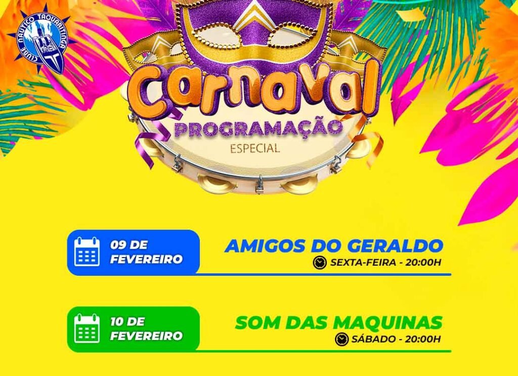 O Clube Náutico Taquaritinga convida você a celebrar o Carnaval em grande estilo à beira do mar! No dia [Data], a partir das [Horário], prepare-se para uma festa única repleta de alegria e diversão. O evento contará com um desfile de fantasias criativas, música contagiante, gastronomia exclusiva e atividades aquáticas emocionantes. Todos os sócios e seus convidados são bem-vindos, garantindo uma celebração inesquecível. A participação ativa dos sócios na organização é incentivada para assegurar o sucesso desta festa épica. Marque a data, convide amigos e familiares, e venha se perder na magia do Carnaval no Clube Náutico Taquaritinga.